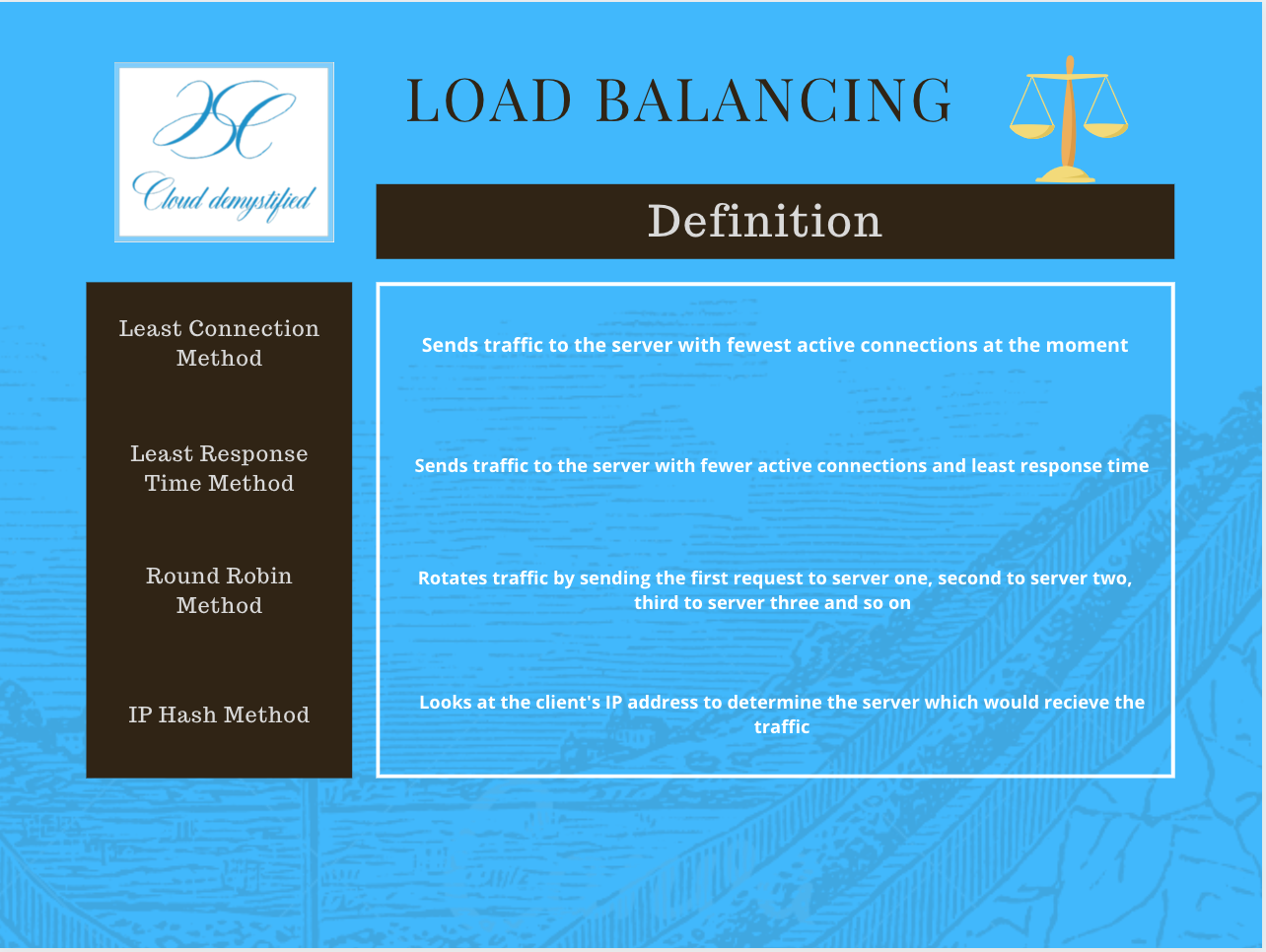 Load balancing simply means balancing network load across different servers in the Cloud to optimize service, reduce delays and improve availability. Since a Cloud is made up of many servers (Refer to ), Load Balancers make sure that any traffic (incoming or outgoing) is balanced well across the servers. This ensures high availability and low latency (or delay in response), since no particular server is under immense load at once.