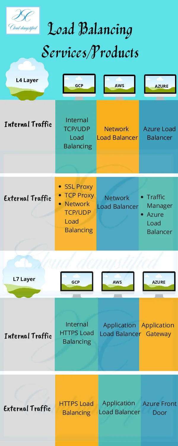 Traffic Public Cloud Providers (AWS, GCP and Azure) provide the following load balancing services based on the type (internal/external) and characteristics (L4/L7 layer) of the incoming traffic