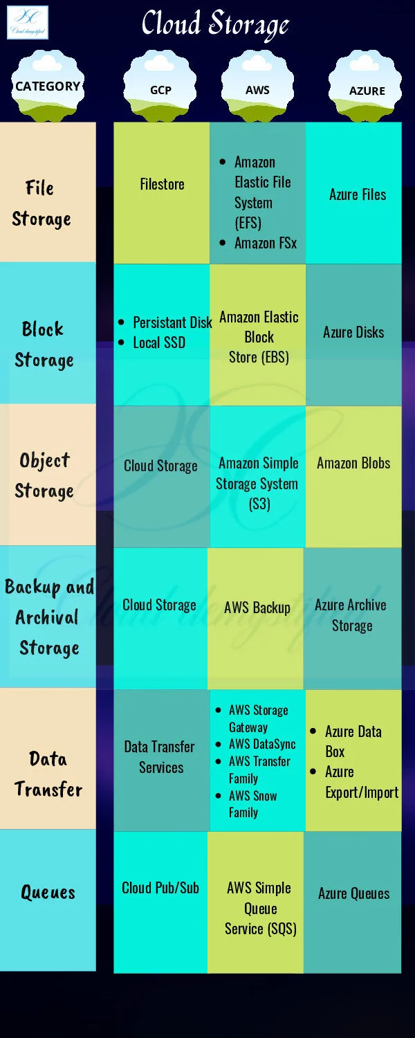 Here’s an infographic of the different Storage options provided by AWS, GCP and Azure: